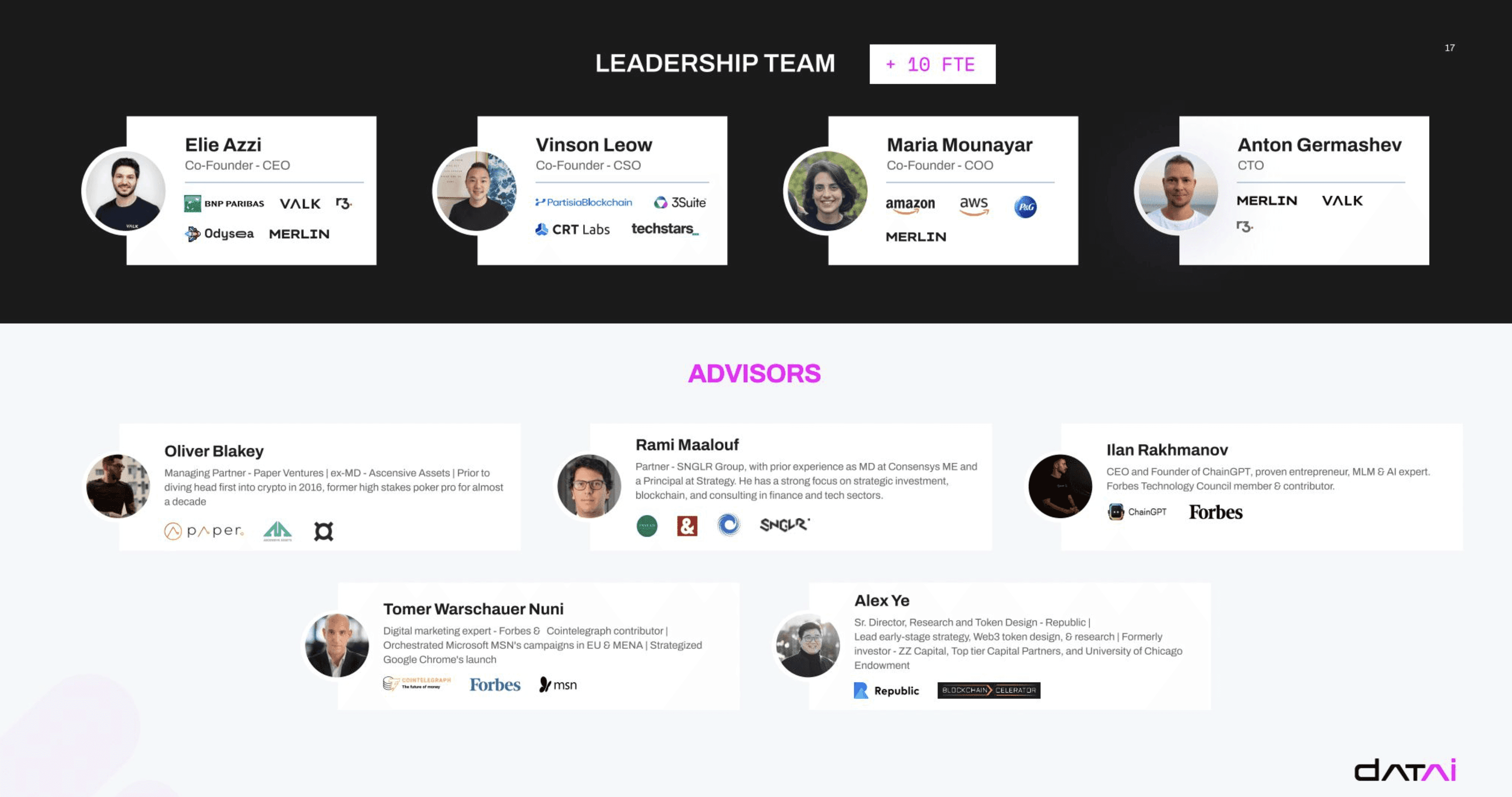 Datai Network’s team is comprised of blockchain pioneers, AI specialists, and seasoned industry veterans. Supported by renowned backers like ChainGPT Labs, Shima Capital, and Ava Labs, the team is dedicated to driving innovation and excellence in blockchain analytics.